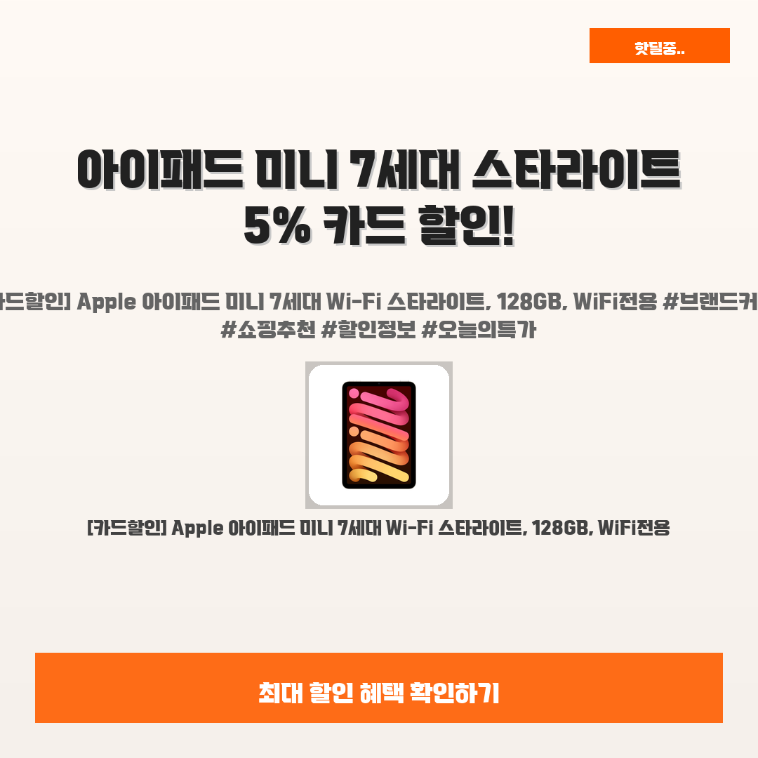 🛍️ 이 포스팅은 네이버 쇼핑 커넥트 활동의 일환으로,판매 발생 시 수수료를 제공받습니다.오늘은 특별히아이패드 미니 7세대 스타라이트를 소개해드릴게요! 🎉최근에 업데이트된 아이패드가 필요하시다면, 이 제품은 정말 최적의 선택이에요. [카드할인] Apple 아이패드 미니 7세대 Wi-Fi 스타라이트, 128GB, WiFi전용는 탁월한 성능과 디자인을 자랑해요!가벼운 무게와 세련된 스타라이트 색상은 언제 어디서나 사용하기 편리하죠. 친구들은 이 제품을 보면서 대박!이라고 할 거예요. 😊최근에 5% 카드할인으로 711,550원에 구입할 수 있으니, 이 기회를 꼭 잡으세요!다양한 기능과 함께 즐길 수 있는 아이패드 미니로 일상생활을 더욱 즐겁게 만들어보세요!후회 없는 선택이 될 거라 장담합니다! 지금 바로..